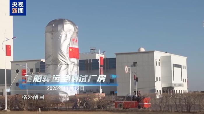 11月12日15时,神舟二十二号飞船渐渐驶向测试厂房,开展后续的测试服务。五星红旗在阳光的照射下,格外明慧。