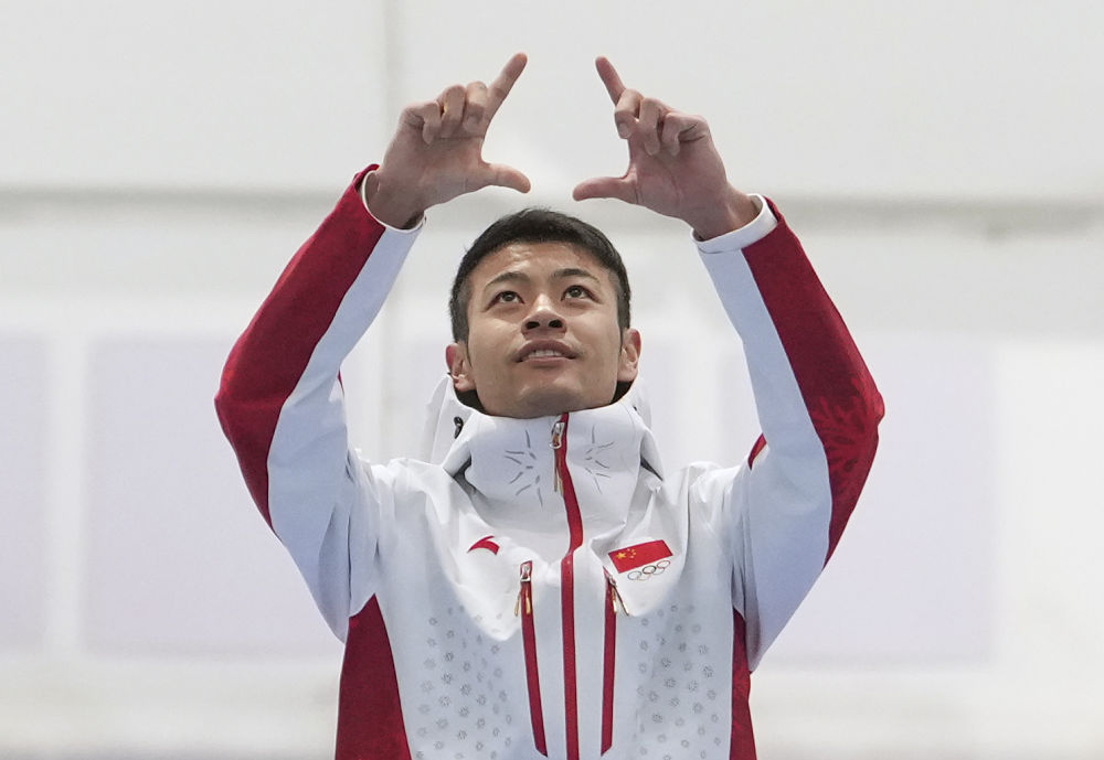 ↑2月8日,中国选手高亭宇在第九届亚冬会速率溜冰男人100米决赛后庆祝夺冠。新华社记者 李一博 摄