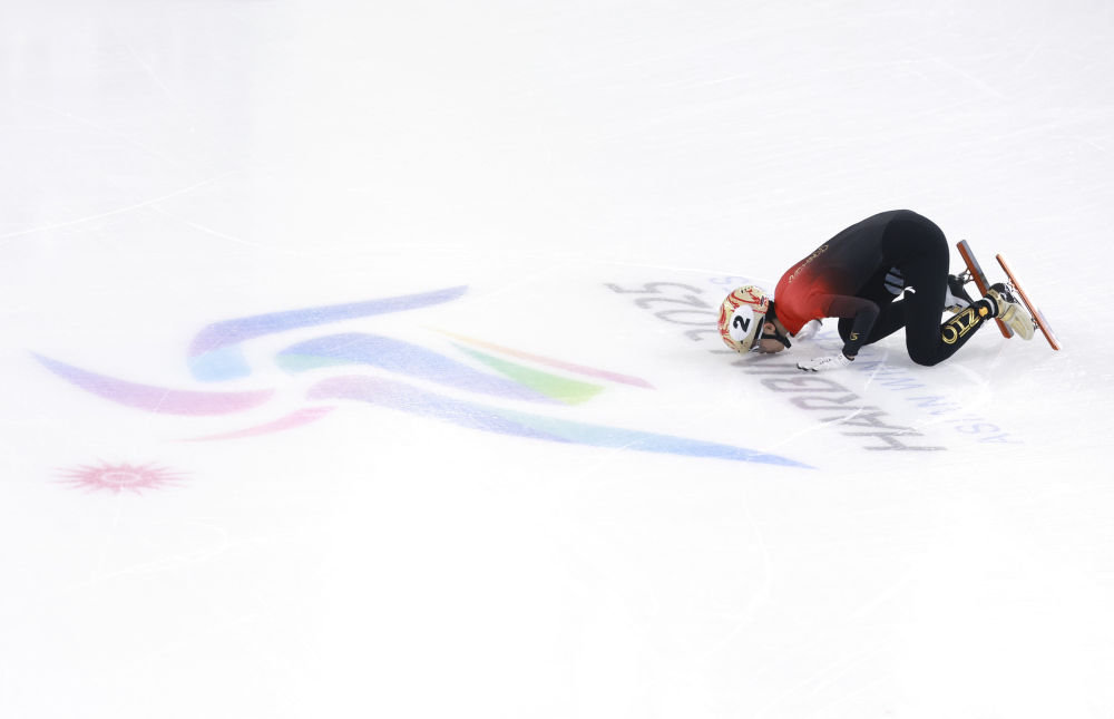 ↑2月9日,在第九届亚冬会短谈速滑女子3000米奋勉A组决赛后,获取冠戎行的中国队选手范可新央求亲吻冰面。这是范可新终末一次进入亚冬会。新华社记者 许雅楠 摄