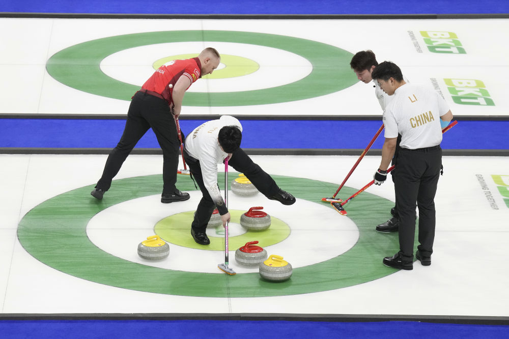 ↑4月6日,中国队选手徐晓明(左二)在加拿大穆斯乔举行的2025年世界男人冰壶锦标赛铜牌争夺战中。