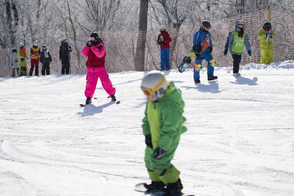 ↑1月15日,单宝源(左六)在亚布力滑雪场为旅客拍照。诞生于黑龙江绥芬河的“00后”单宝源是亚布力滑雪场的兼职滑雪照相师。新华社记者 谢剑飞 摄