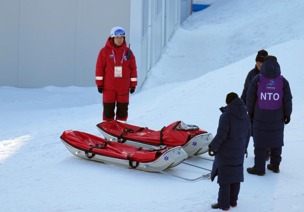 ↑2月11日,雪域拯救专科东谈主员(左)值守在第九届亚冬会开脱式滑雪男人空中手段双东谈主同步赛场内。新华社记者 王松 摄
