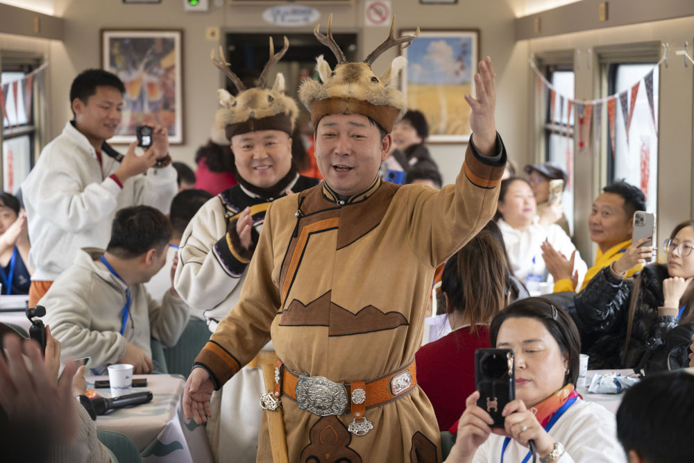 ↑11月26日,在Y783次“悠享龙江·银旅号”旅游列车上,鄂伦春族演员在饰演。该趟列车是中国铁路哈尔滨局集团有限公司今冬开行的首趟高品性冰雪旅游列车。新华社记者 张涛 摄