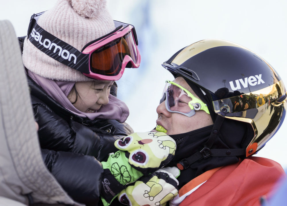 ↑12月20日,中国开脱式滑雪通顺员都广璞(右)的儿子在赛后为他摘下护脸。都广璞在河北省张家口市崇礼区云顶滑雪场进行的外洋雪联开脱式滑雪空中手段世界杯(云顶站)中获取银牌。新华社记者 卢星吉 摄