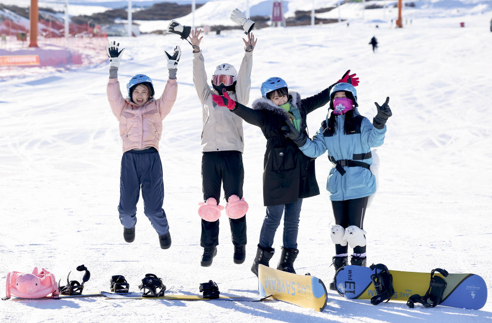 ↑这是2025年1月27日拍摄的几名滑雪爱好者在新疆丝绸之路平地度假区合影迷恋。新华社记者 王菲 摄