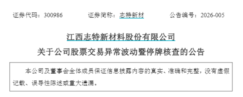 1月12日晚,志特新材(300986)(300986)公告称,公司股票自2026年1月5日至1月12日无间6个往异日涨停,涨幅为198.57%,股价波动较大。为惊奇投资者利益,公司勉强股票往来波动情况进行核查,股票自1月13日开市起停牌,瞻望停牌时辰不提升3个往异日。公司教唆遍及投资者留意二级阛阓往来风险。